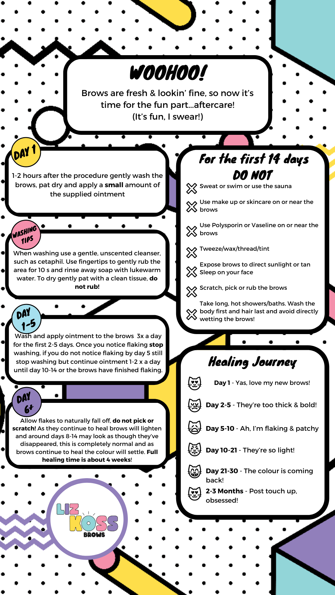 Proper aftercare is crucial to ensure you get the best healed results! A cosmetic tattoo is an investment, so to make sure you get the best results possible please follow the instructions below, and if you have any questions please contact me!